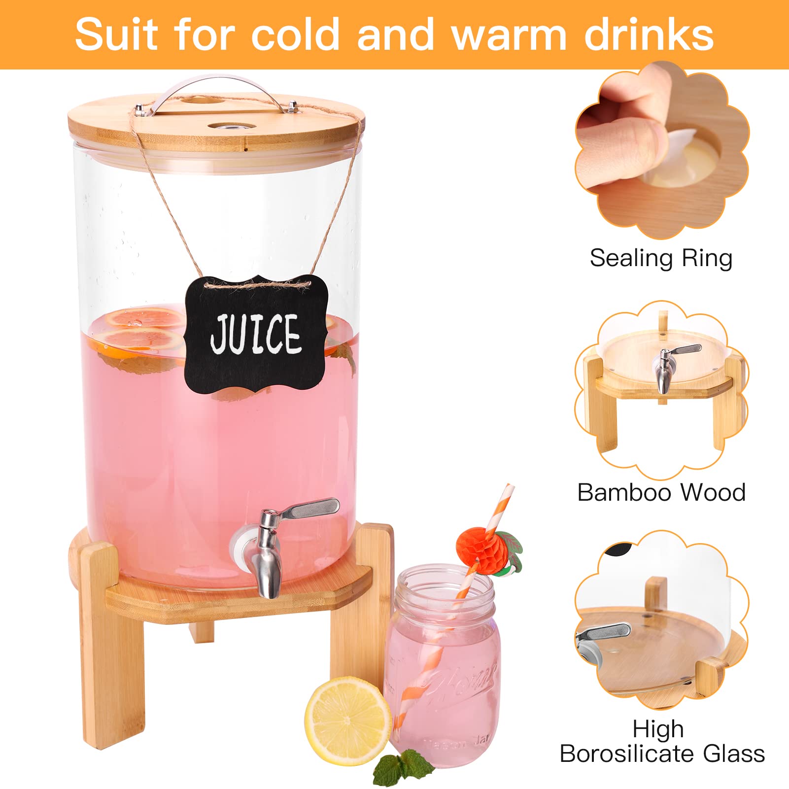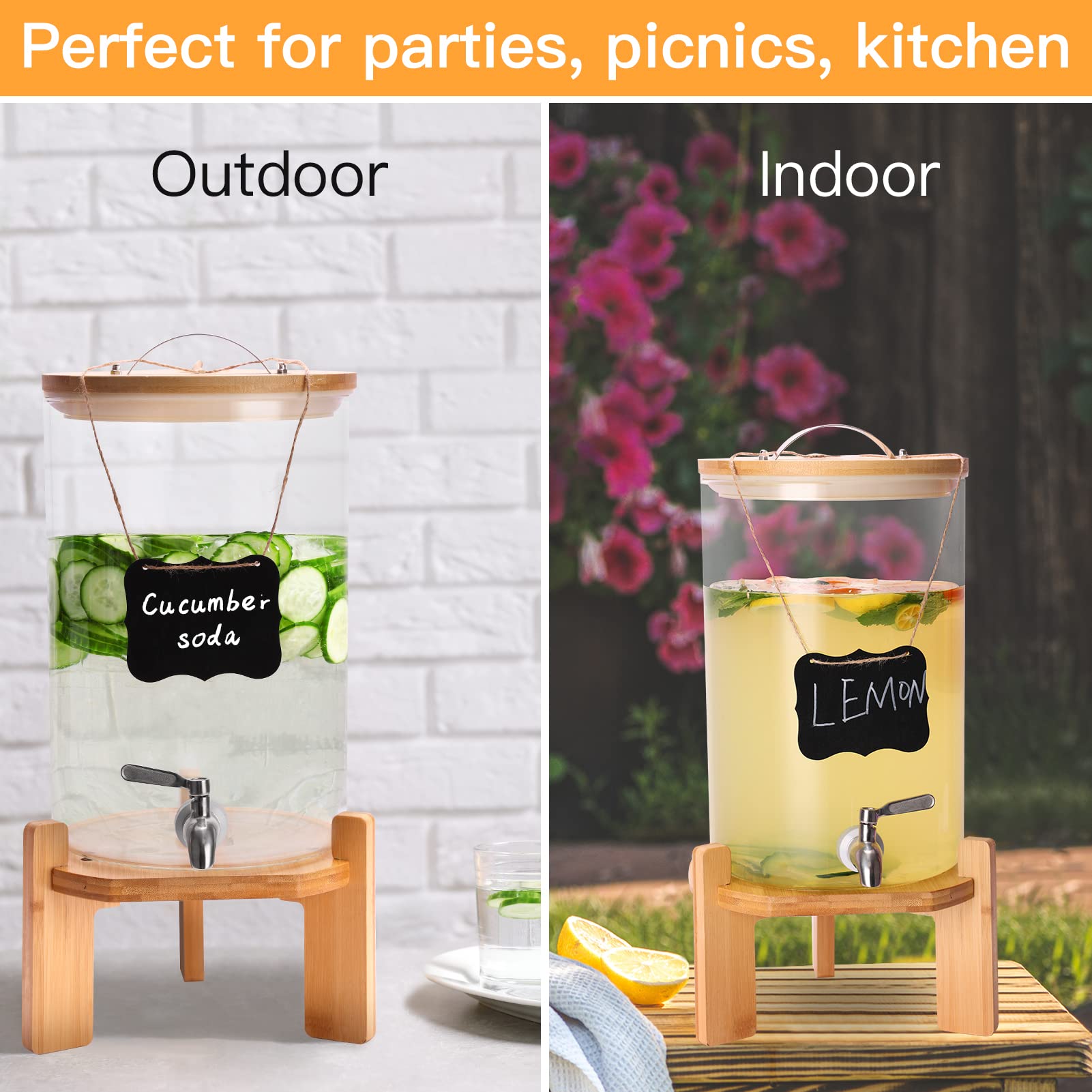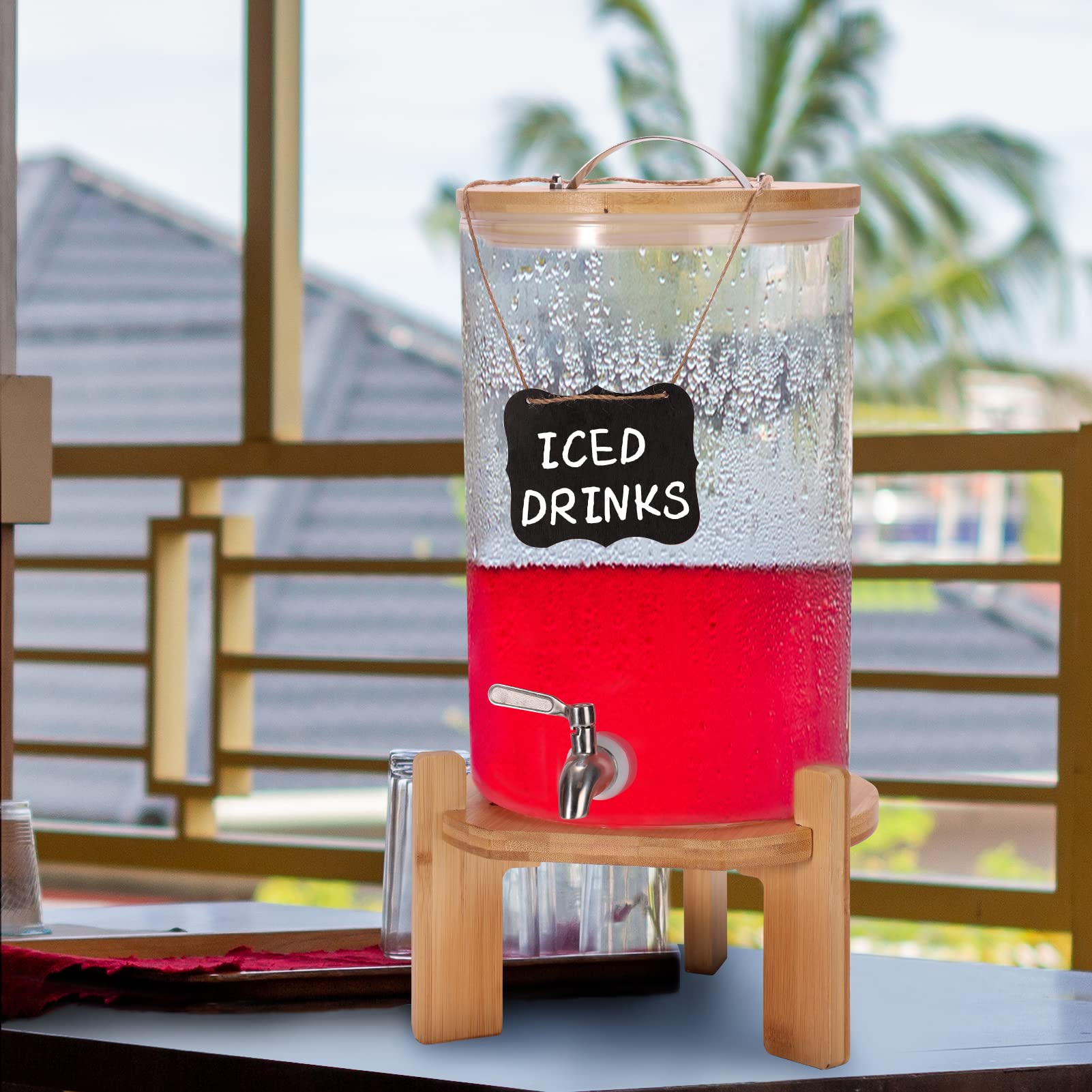 Beverage Dispenser Set: Includes a 2.1 Gallon (8L) glass beverage dispenser with a spout, two chalkboards, an erasable marker, installation tools, and instructions. The dispenser comes with two hanging labels and a marker, making it easy to label your drinks and avoid any confusion@Reliable Material for Filling Beverages: Made of high borosilicate glass material, which is thick, safe and durable. It is resistant to high temperatures and cold, making it suitable for a variety of beverages. Hand wash recommended@Sturdy Bamboo Stand: A triangle design provides stable support for the glass dispenser, keeping it from collapsing. Its simple and elegant appearance makes it great for different theme party occasions. The bamboo stand is easy to assemble and should be wiped clean and kept dry and ventilated after usage@Leak-Proof Design: The stainless steel spout is tight and will not drip and allowing for easy control of the beverage flow. The lid is convenient for adding beverages while keeping items from falling in. An internal sealing ring maintains the freshness of the beverage and keeps it from spillage during transportation@Versatile Usage: The dispenser is perfect for use in the kitchen, at picnics, or even at a pool party. It's suitable for serving both cold and warm drinks. Perfect for parties, picnics, and social events where you need to serve a large number of guests.