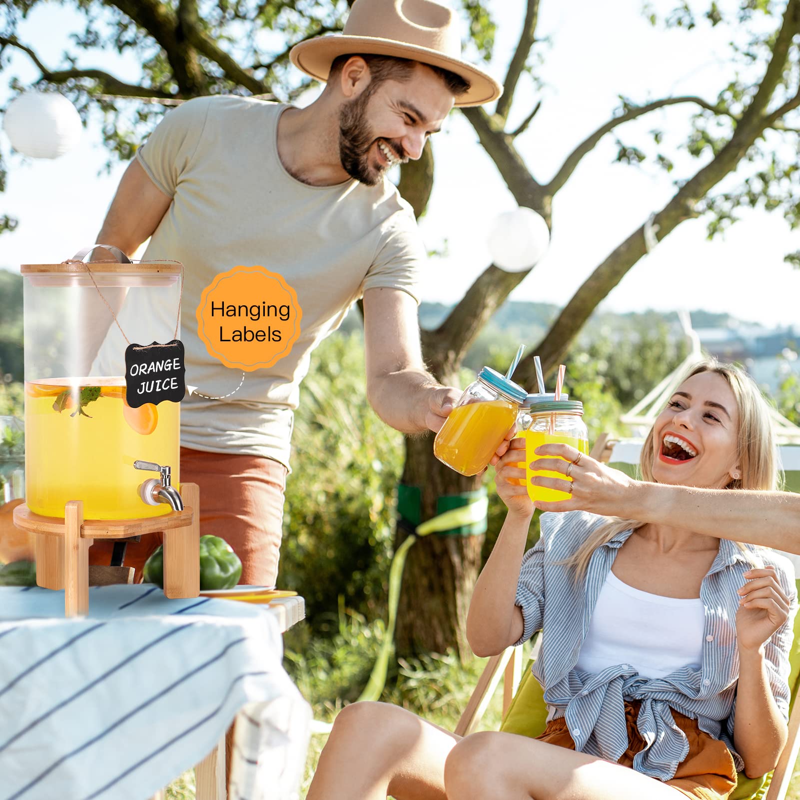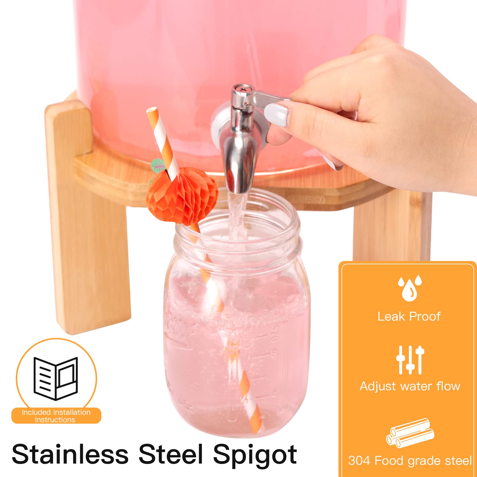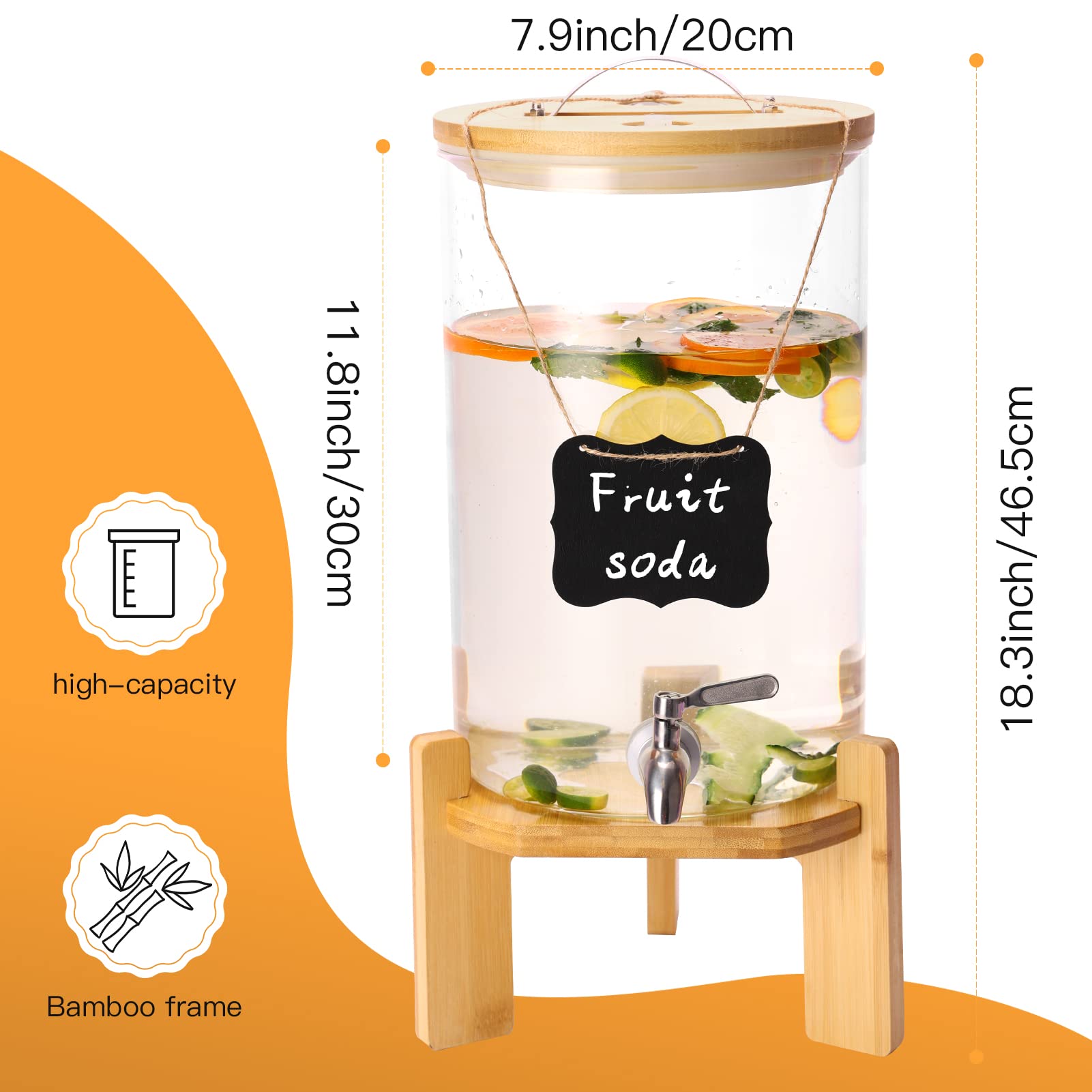 Beverage Dispenser Set: Includes a 2.1 Gallon (8L) glass beverage dispenser with a spout, two chalkboards, an erasable marker, installation tools, and instructions. The dispenser comes with two hanging labels and a marker, making it easy to label your drinks and avoid any confusion@Reliable Material for Filling Beverages: Made of high borosilicate glass material, which is thick, safe and durable. It is resistant to high temperatures and cold, making it suitable for a variety of beverages. Hand wash recommended@Sturdy Bamboo Stand: A triangle design provides stable support for the glass dispenser, keeping it from collapsing. Its simple and elegant appearance makes it great for different theme party occasions. The bamboo stand is easy to assemble and should be wiped clean and kept dry and ventilated after usage@Leak-Proof Design: The stainless steel spout is tight and will not drip and allowing for easy control of the beverage flow. The lid is convenient for adding beverages while keeping items from falling in. An internal sealing ring maintains the freshness of the beverage and keeps it from spillage during transportation@Versatile Usage: The dispenser is perfect for use in the kitchen, at picnics, or even at a pool party. It's suitable for serving both cold and warm drinks. Perfect for parties, picnics, and social events where you need to serve a large number of guests.
