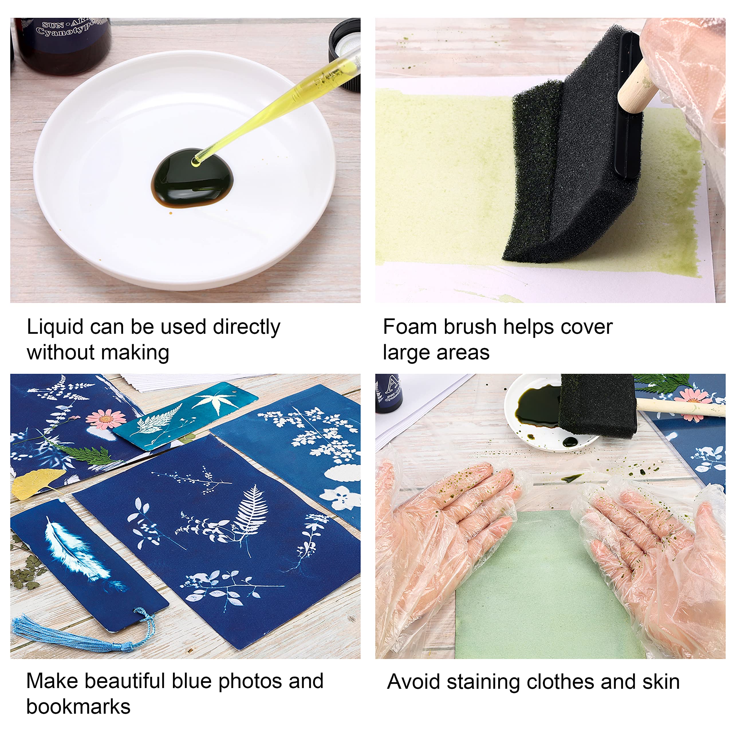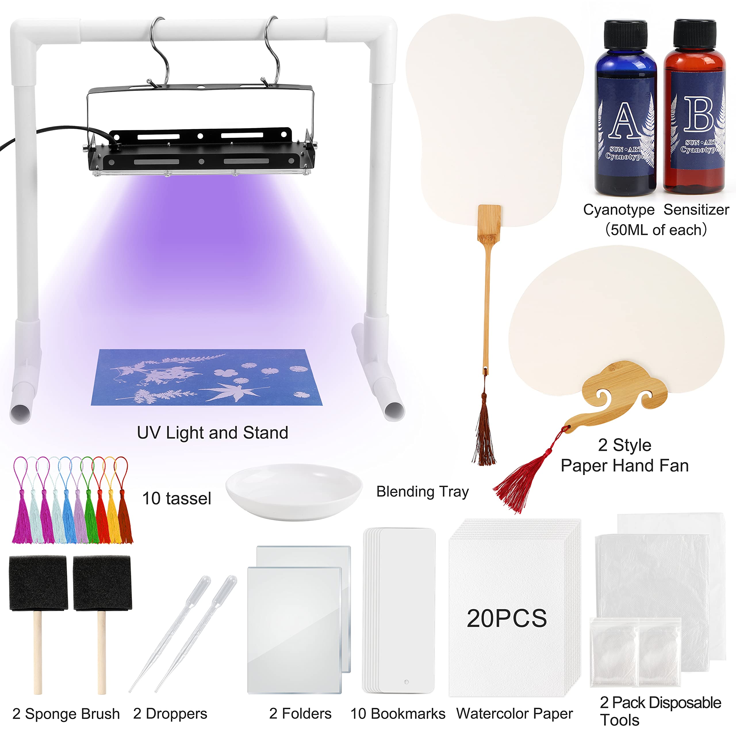 【Cyanotype Kit】Come with 2 x cyanotype sensitizer (50ml of each), 1 x cyanotype exposure light, 20 x watercolor paper, 2 x paper hand fan, 2 x folders, 2 x sponge brush, 2 x droppers, 10 x bookmarks, 6 x disposable tools, instruction, blending tray. With sufficient accessories to meet the needs of the cyanotype process@【UV Light for Cyanotype】Cyanotype light requires self-assembly, but the detailed instructions make it easy. UV light for cyanotype meets the needs of indoor exposure, which can effectively shorten the sun print paper exposure time and make the coloring more uniform. UV lamp cyanotype is equipped with a switch button, which is self-controlled and easy to operate. Lights are also suitable for screen printing exposure@【Simple Cyanotype Operation Guidelines】Brush the liquid onto paper, dry it, and place it on plants, flowers, or other things on the paper. Then press it with transparent glass or acrylic board, place it in the sunlight, rinse the paper with water, and dry it to obtain a wonderful blue sun product@【Intention of Accessories Provided】Cyanotype sensitizer needs no mixing and is easy to apply to various materials such as fiber, cotton, canvas, wood, cotton, silk, and linen. Provide a sufficient number of blank fans and bookmarks for continuous practice, allowing you to create cyanotype products with different patterns for exquisite home, office, and school decoration@【Art Under the Sunshine】Cyanotype is a simple and interesting traditional dyeing craft with a strong cultural connotation. Great for working with children, family, and friends at home, in the classroom, to enhance children's hands-on skills, satisfy their curiosity, cultivate their artistic interest, and enjoy the fun creations brought by natural