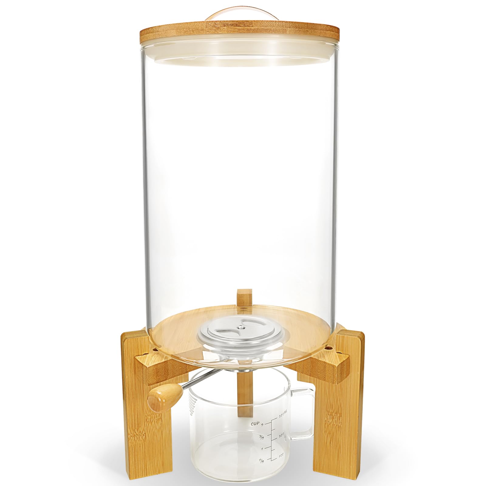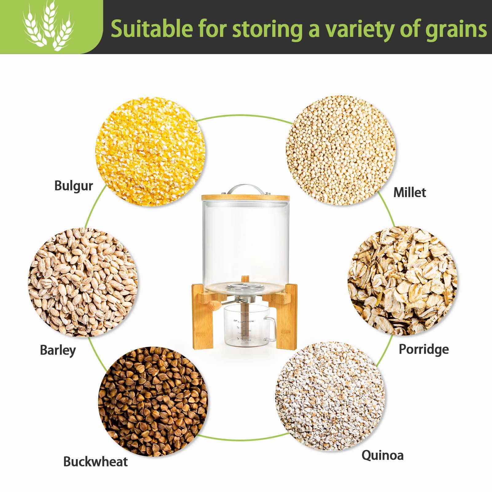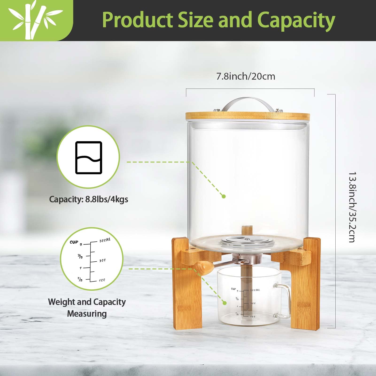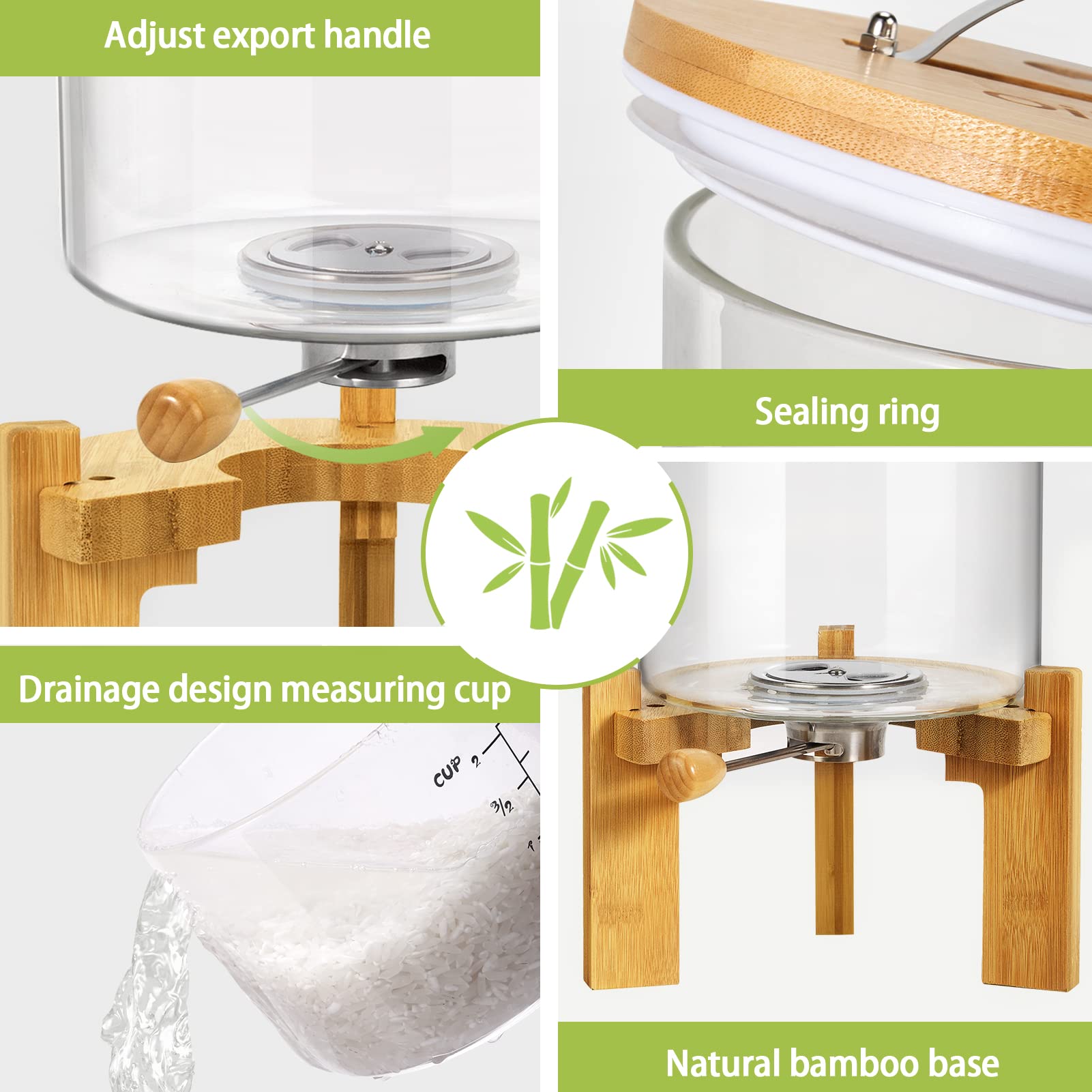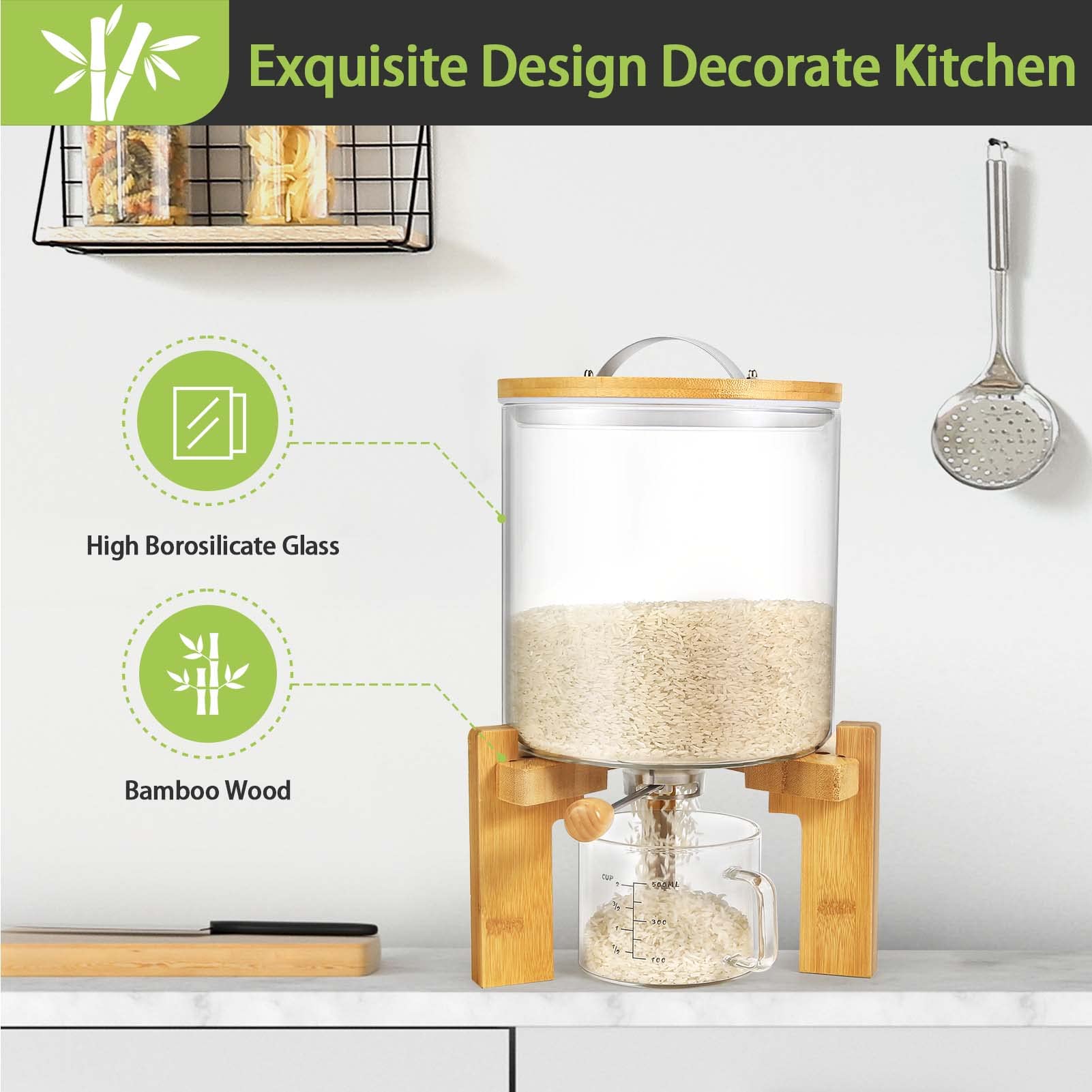 Strong Glass Rice Dispenser: Rice Storage Dry Food Capacity: 5L. Rice container with wooden stand and measuring cup. It can keep your kitchen organized@Manual Air Release Valve: The exit of the cereal dispenser is designed at the bottom of the bucket, you can control the rice or grain by manual valve, and the exit is convenient for closing and rice won't get clogged up@Sealed and Moisture-proof: The lid is made of natural bamboo and with a food-grade PP material, has a sealing effect, is moisture-proof and dust-proof. suitable for storing sugar, rice, nuts, beans, cereal, snacks, pet food.@Easy to Fill and Easy to Use: Rice dispenser makes it so much easier to store my rice and dispense it. Glass container transparent visible, you just look at the clear window and it will show exactly how much it have left@Easy Use: Conveniently adjust and measure amounts of rice dispensed with the handle. Package includes rice measuring cup with scale, which allows for accurate measure of amounts dispensed
