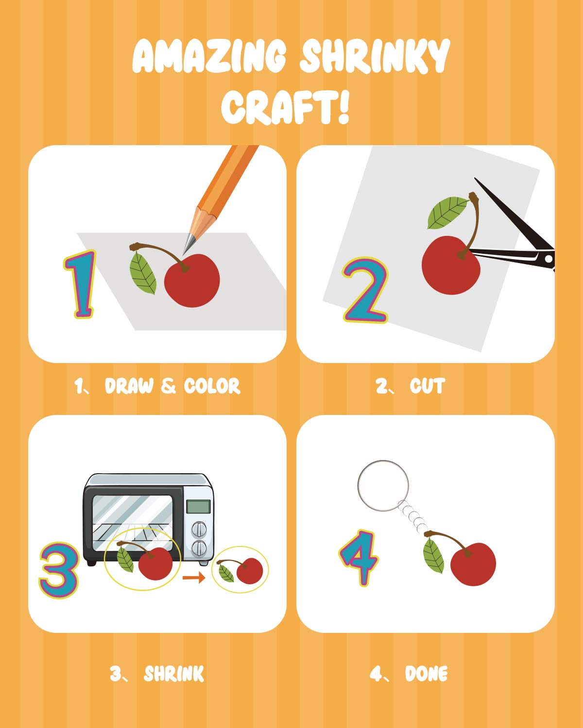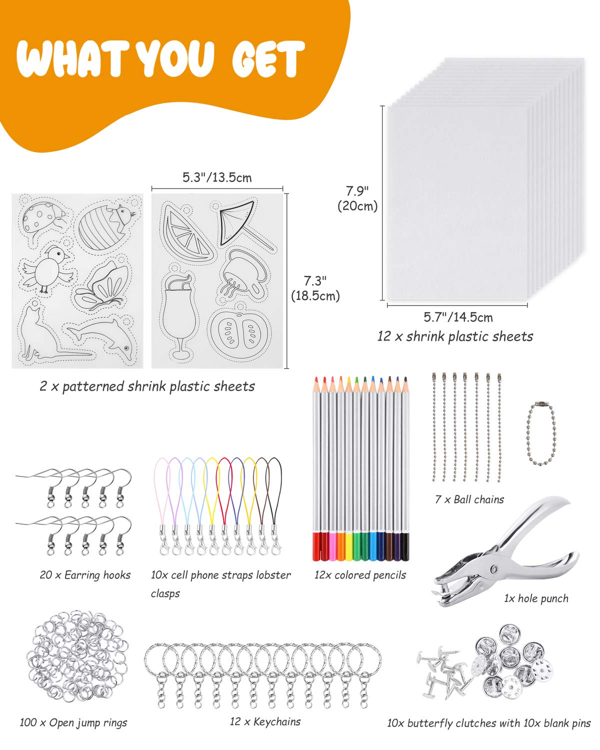 VARIOUS JEWELRY MAKING ACCESSORIES - 10 x key chains, 5 x bead chains, 10 x ear hooks, 100 x open jump rings, 10 x butterfly clutches with 10 x blank pins, different fittings for kid’s DIY craft@PROPER SIZE - Approx. 7.9 x 5.7 inch/ 20 x 14.5 cm, 0.01inch/0.3 mm thick. The shrink plastic sheets could be shrunk to 20% of its original size@FREE DRAWING - Blank sheets are ready for any kids art freestyle, leaving enough space for kid's imagination and creation@EASY TO PLAY - Package comes with 2 patterned sheets for beginners and just need to color the image, cut it out with scissors and they will shrink in your oven@WIDE APPLICATIONS - Endless creative uses of key chains, jewelry, buttons, gift tags, zipper pulls, bookmarks, scrap booking, and ornaments