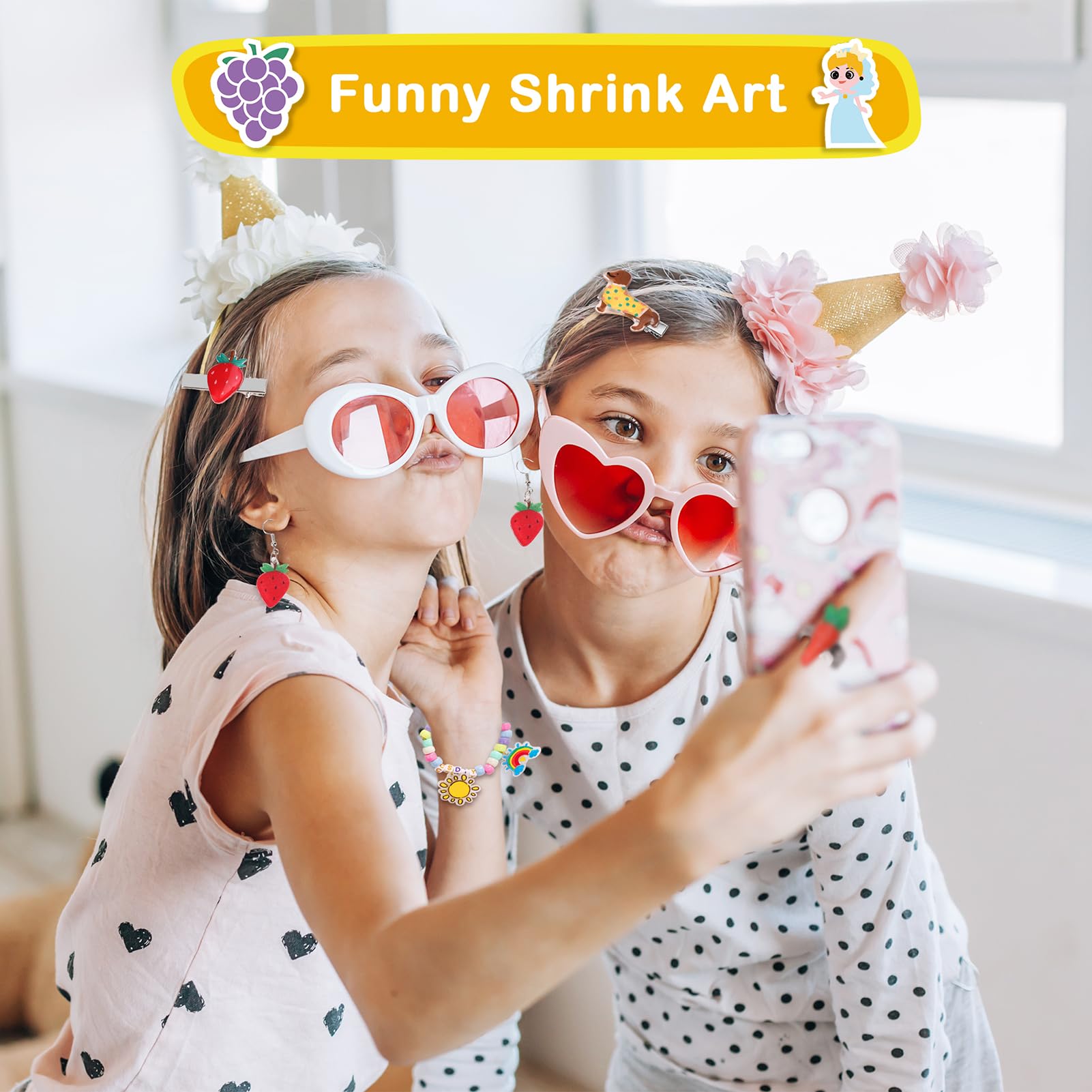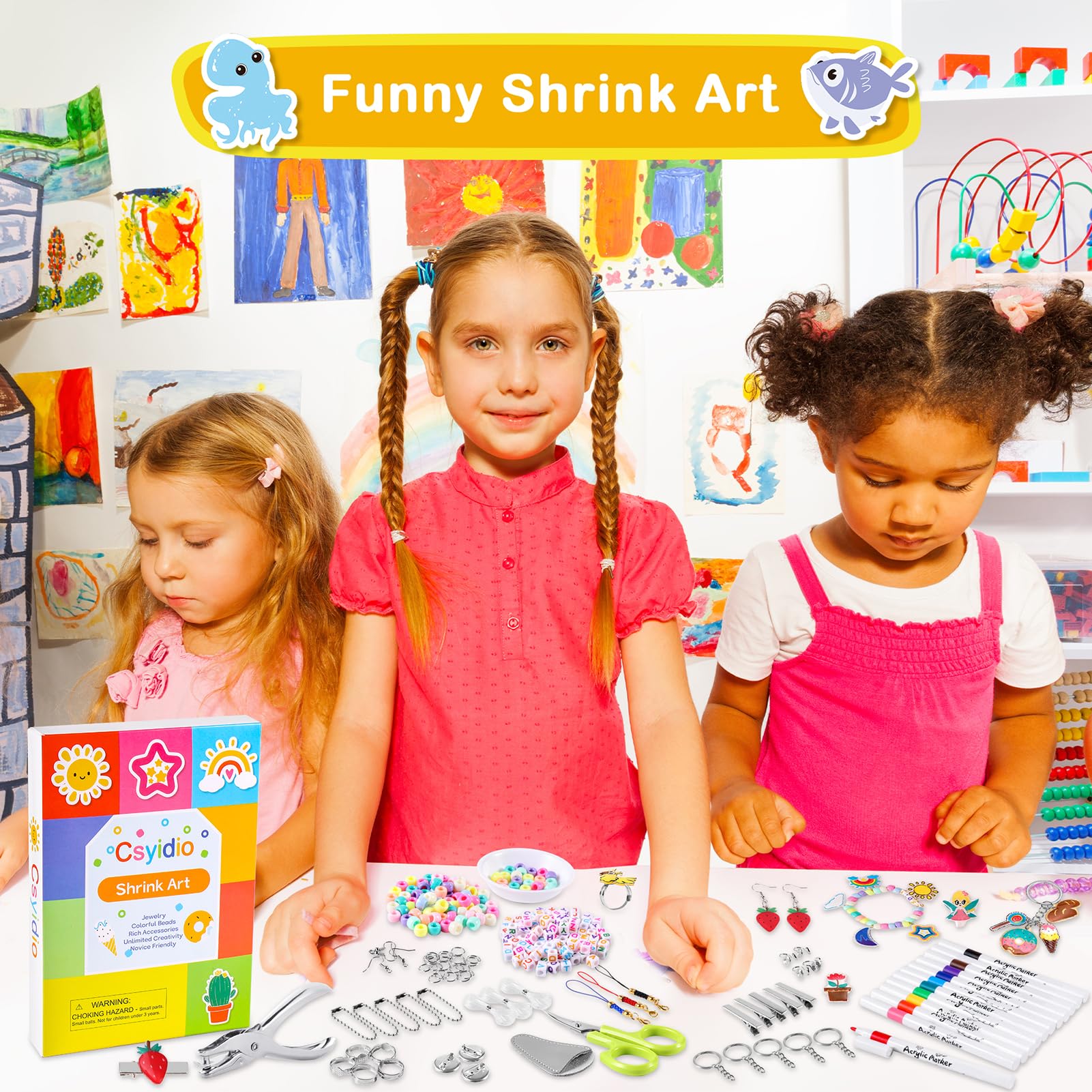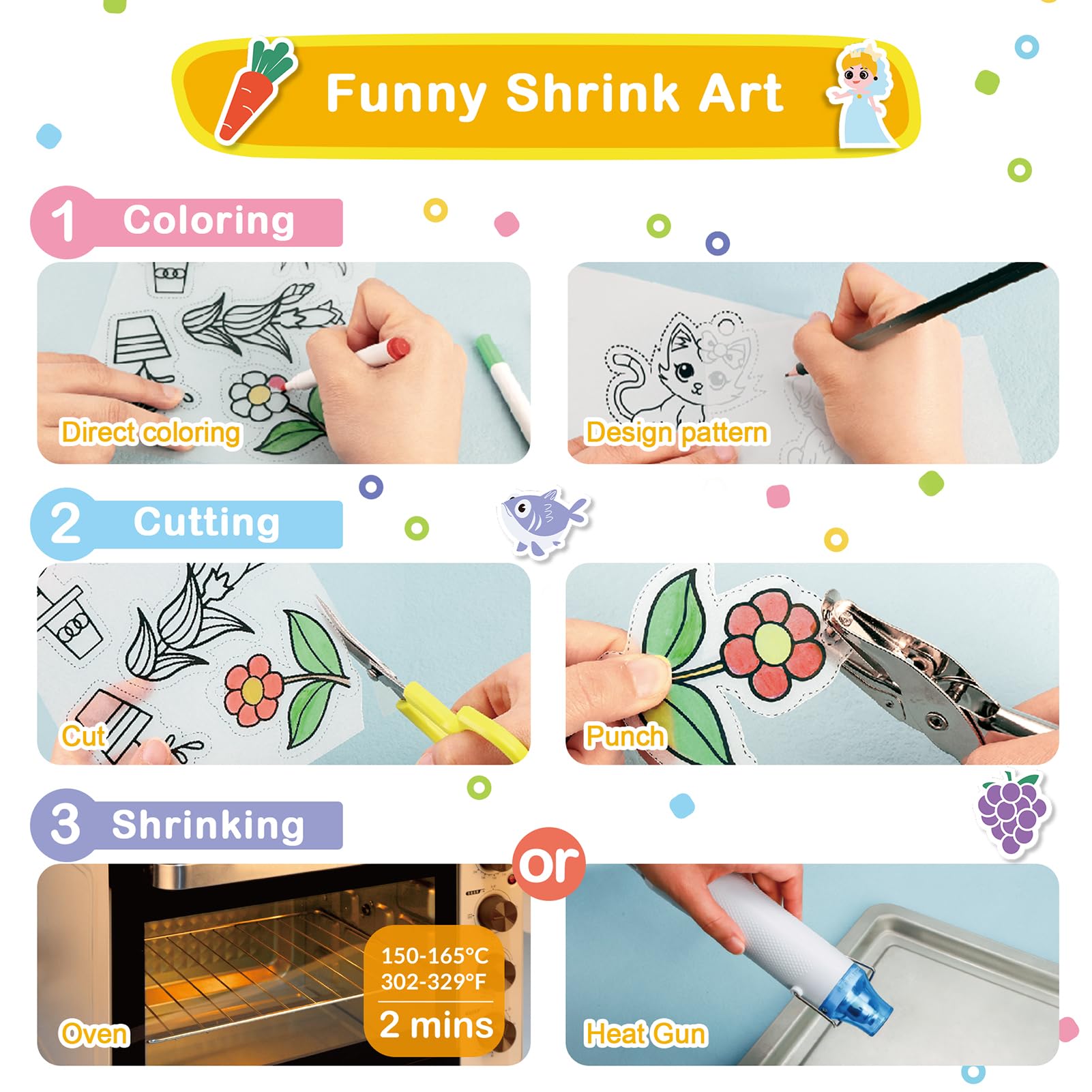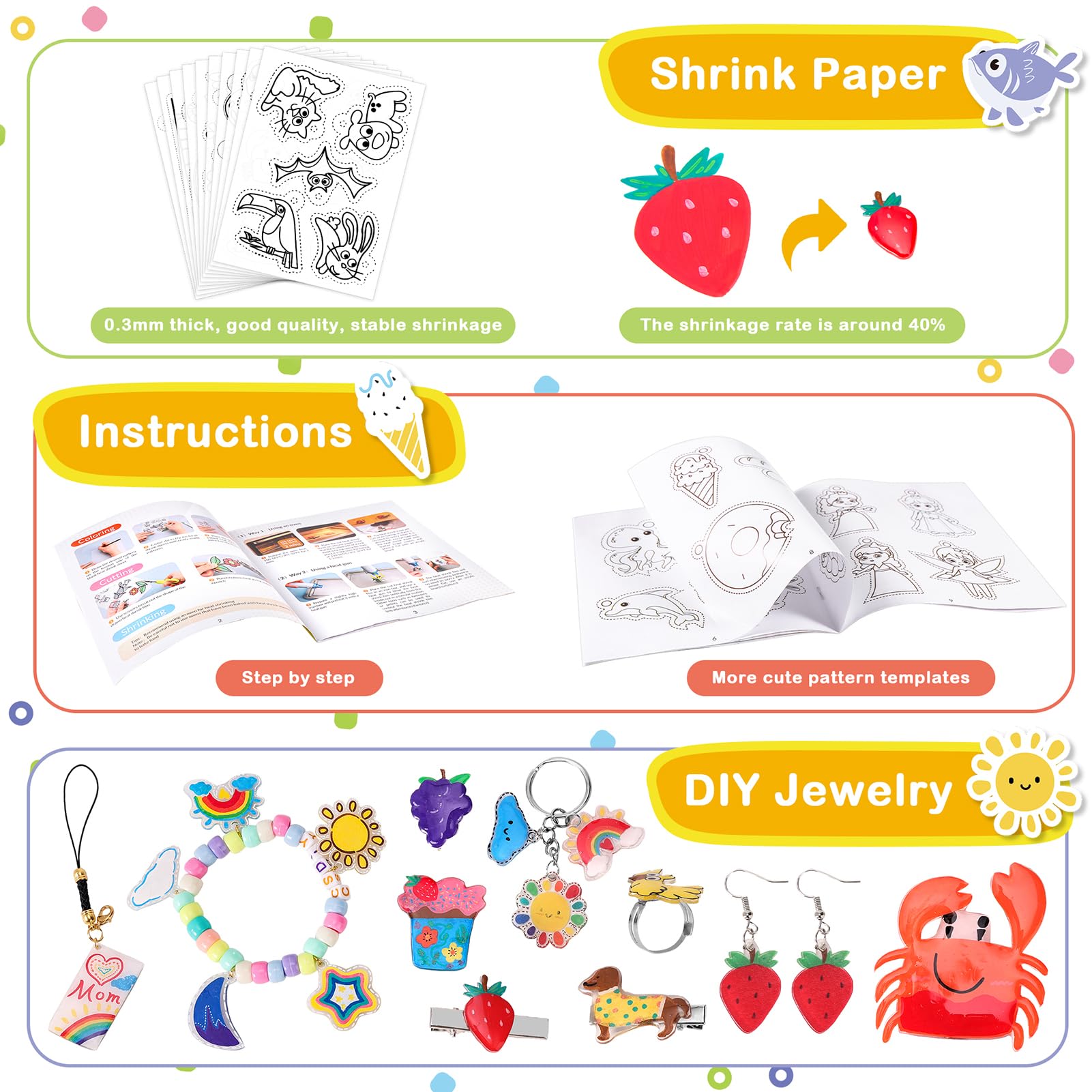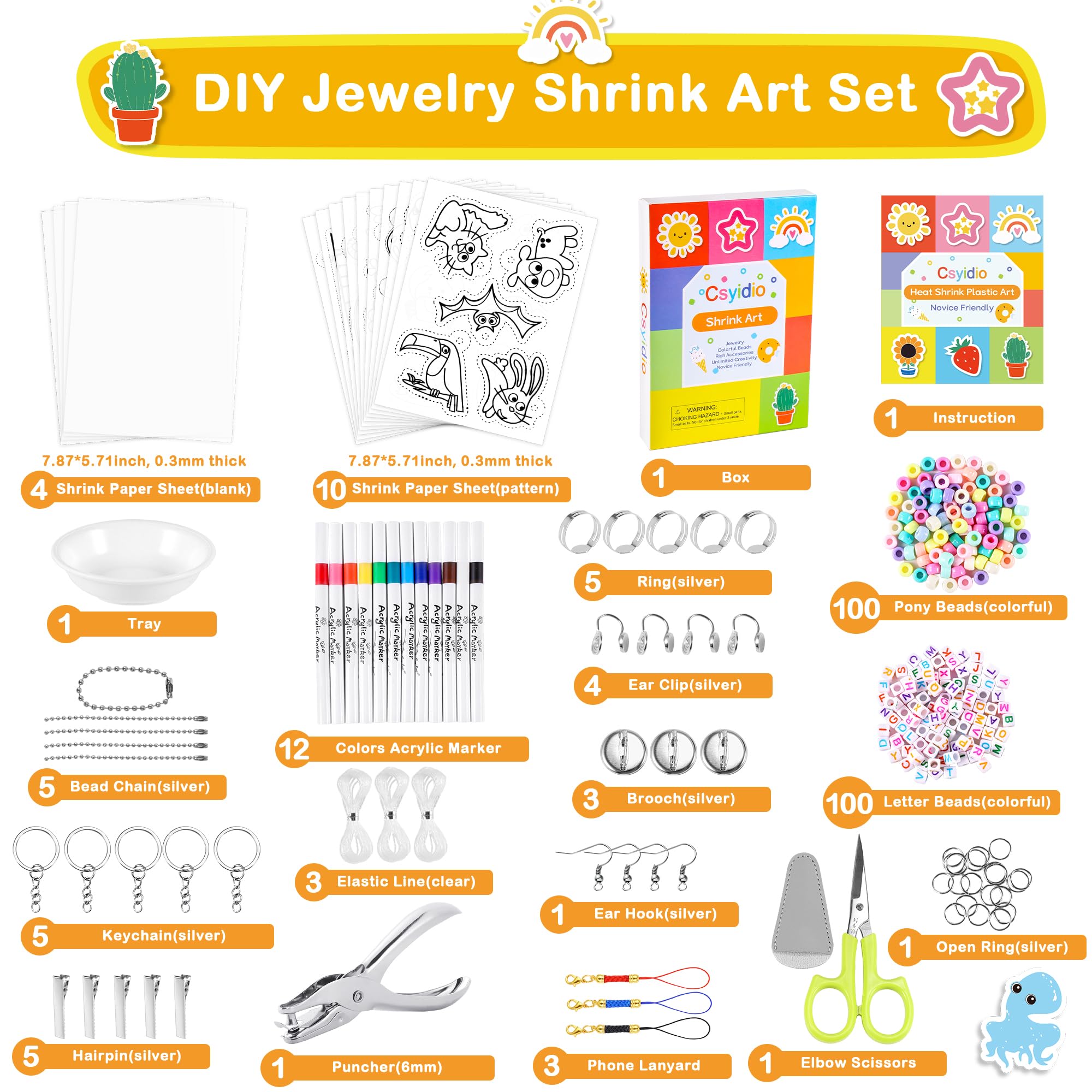286 PCS Shrink Film Kit: The shrink film paper set contains a complete set of shrink art tools, covering the process of coloring, cutting, shrinking, and sealing, with detailed instructions, allowing beginners to enjoy heat shrink creation while keeping clean and tidy@Quality Shrink Plastic Papers: Coming with 4 blank shrink paper sheets and 10 patterned shrink paper sheets, which size are 8 x 5.7 inches / 20 x 14.5 cm, 0.01 inch/ 0.3 mm thick, and the shrinkage rate is 40%. The included instruction contains 28 cute template patterns on the inner page to help you make eye-catching shrink art crafts@Various Tools & Accessories: 12 acrylic pigment pens, 1 punching tool (6mm), 1 elbow scissors, 1 plastic tray, detailed instructions and 257 pieces various accessories for DIY@Easy to Make Exquisite Crafts: You can draw your favorite pattern or use our prepared pattern, color it, and cut out the drawing shape, then put it in the oven and bake for 1-2 minutes, after cooling choose your favorite accessories to decorate it. Its quality materials ensure that the finished product can be for an extended period without fading or deterioration@Multi Usage Shrink Kit: Shrink sheets kits are full of fun. They can be used to make personalized keychains, pendants, earrings, refrigerator stickers, and more. Also can be used as presents, or presents for children who enjoy doing arts and crafts projects
