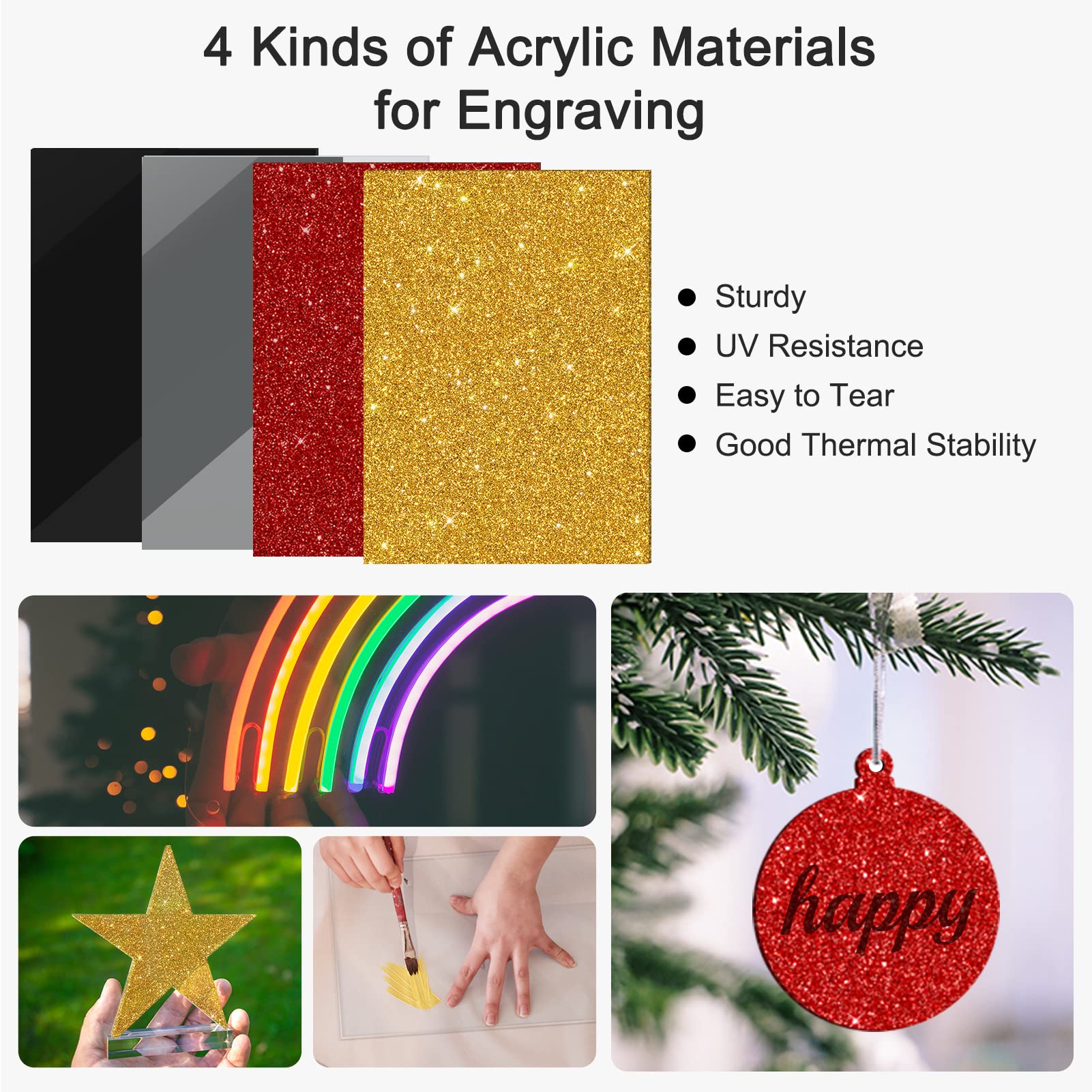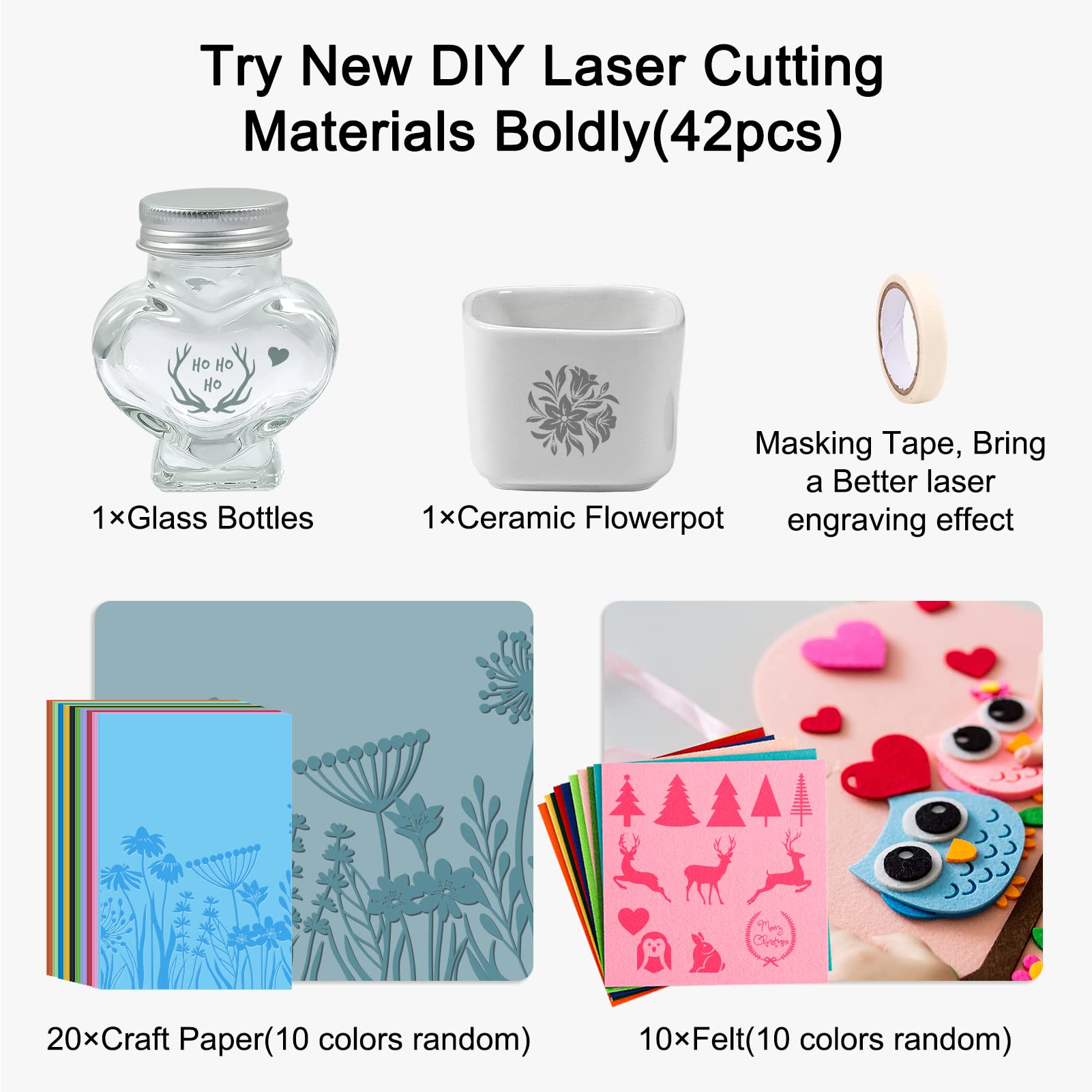 Laser Engraving Material Kit: A total of 220 PCS of engraving material box are provided with abundant laser engraving test materials, which are made of 11 materials including glass, wood, metal, acrylic, rubber, leather, stone, ceramics, paper, felt, masking tape, to meet your needs for a variety of engraving materials@Parameter Specification: The instruction provides the recommended processing parameters for each laser engraving accessory in detail, controlling the time and power more accurately, to help you quickly obtain the desired carving effect@Quality: Every laser cutting material has gone through strict quality control, so it is of high quality to ensure the laser project goes smoothly@Abundant Materials: Enough items of different materials. You can create personalized designs of stainless steel hip flasks and tags; Glass bottles; Ceramics; Customized wooden and leather key rings and coasters; Acrylic plates of different colors. Apply self-made products to daily life@Enjoy the Fun of Laser DIY: Suitable for laser engraving beginners, novices and DIY enthusiasts to freely create personalized works. The engraving material box presents excellent engraving effects, adding more customized decoration to your home, store, office