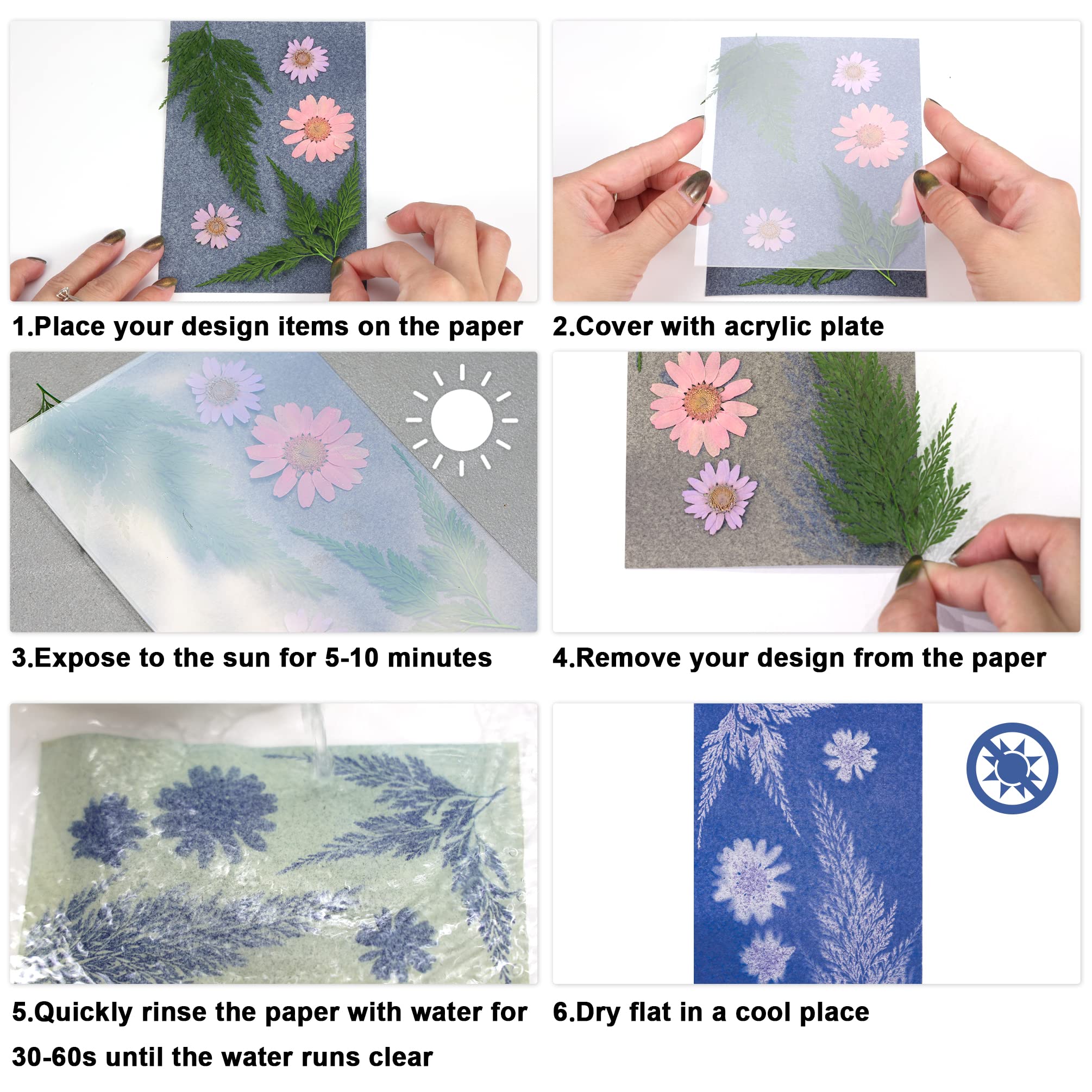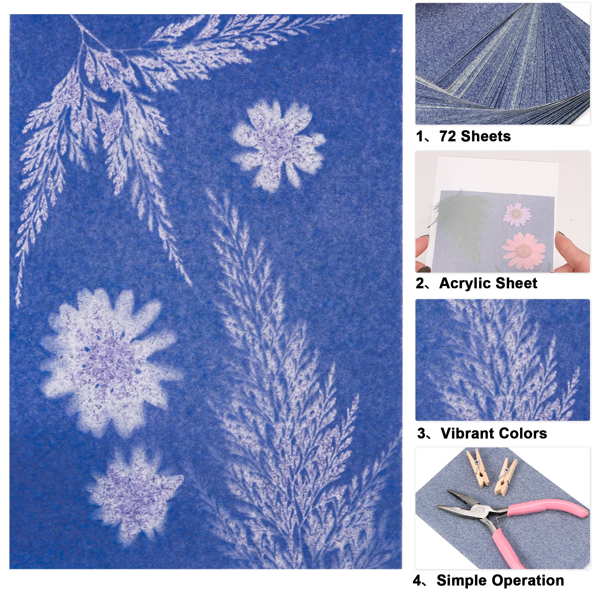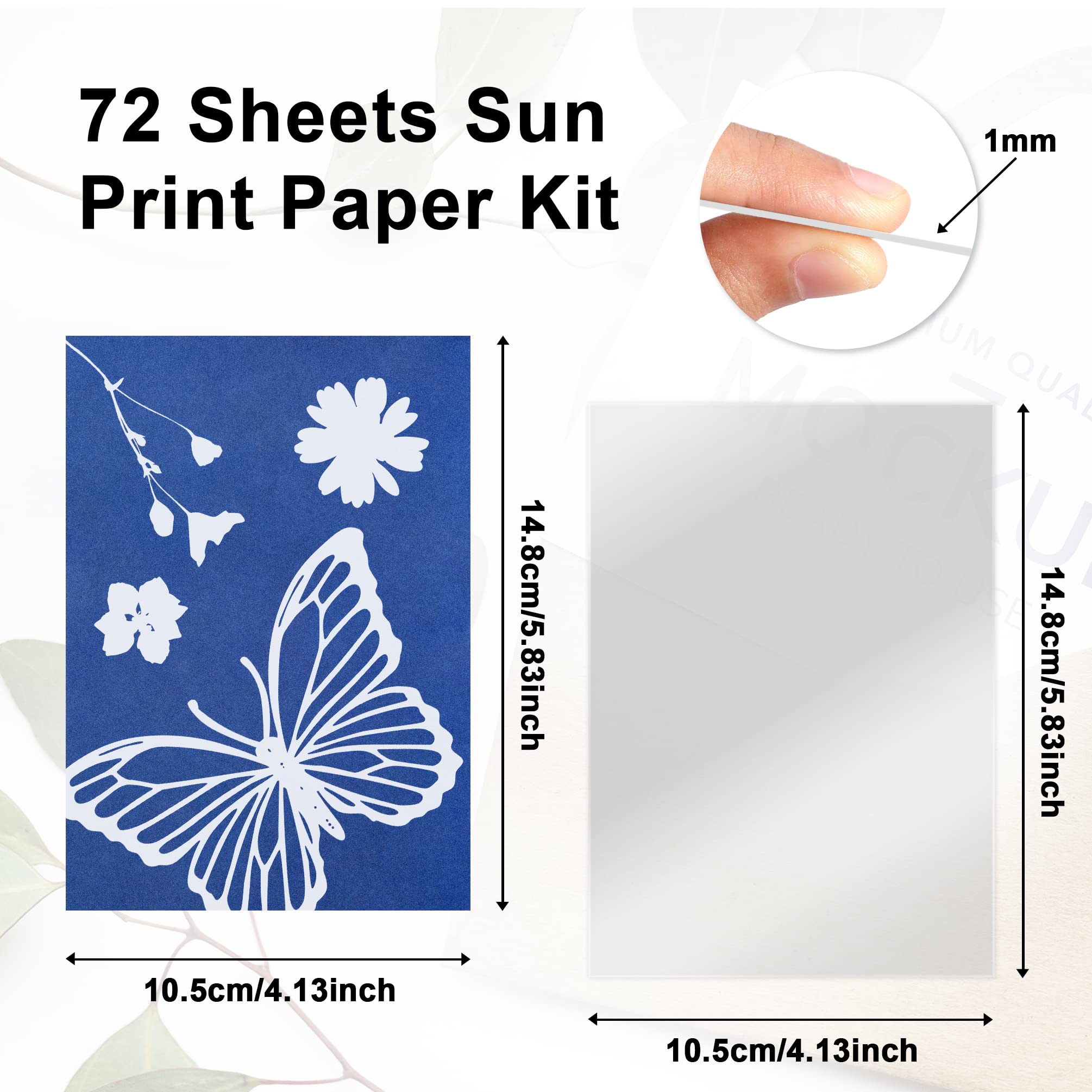 Package Included: 72 sheets of solar printing paper(4.13 x 5.83 Inch)with 1 sheet acrylic plate,which is enough for your daily use and replacement needs@Fun of DIY:You will get 72 sheets of drawing paper,enough for daily use,replace and share with your friends to enjoy a happy DIY time.You can make beautiful patterns by simple operation and use them as exquisite gifts or souvenirs for your relatives,friends or classmates@Sun-based Science: Use the power of the sun to create art,put plants,flowers or other things on the paper,then press it with clear glass or acrylic board,put it under the sun,then rinse the paper with water and dry it to get beautiful art@Good Design: Sensitive nature printing paper is made of blueprint paper material,not easy to break or tear,light weight,but please note that it needs to be stored away from light to avoid exposure@Wide Application: Sun art paper is a great craft activity that can be used as a science tool to create together in classrooms,camps,libraries,etc. to develop children's interest and improve their hands-on skills,and the finished product is also beautiful decoration