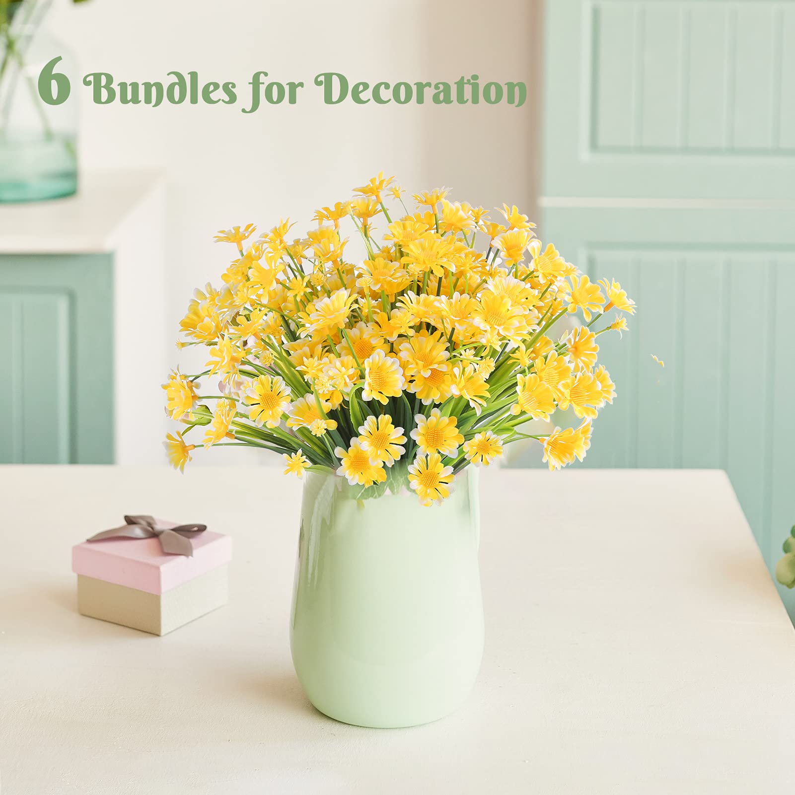 True to Life: Come with 6 vivid purple artificial flowers presents a wild profusion of vegetation to create a warm atmosphere and surprise fresh for your space@Premium quality: Made of non-toxic plastic materials, each one has 7 pliable stems and dense leaves, its total size is about 15 inches high, 7inches wide. Artificial flowers are a practical alternative to real flowers, which will keep their fresh and beautiful year after year@Good for Any Scenes: These realistic flowers add gorgeous atmosphere to your front porch, aisle, interior and garden, nice for for daily decoration, birthdays, festivals, weddings, hotels, memorial sites, DIY projects that full of vitality helps to increase realism@Effortless Caring: Wherever you choose to display, it looks real without need of sunlight, watering, pruning and curing. These fake flowers blooming and keeping their original beauty throughout the year that not fade or damage easily@UV Resistant: Fake daisies flowers Shrubs are resistant to ultraviolet rays and never fade. Putting them in outdoor, front porch, garden, balcony, balcony,or other place that kill real flowers easily