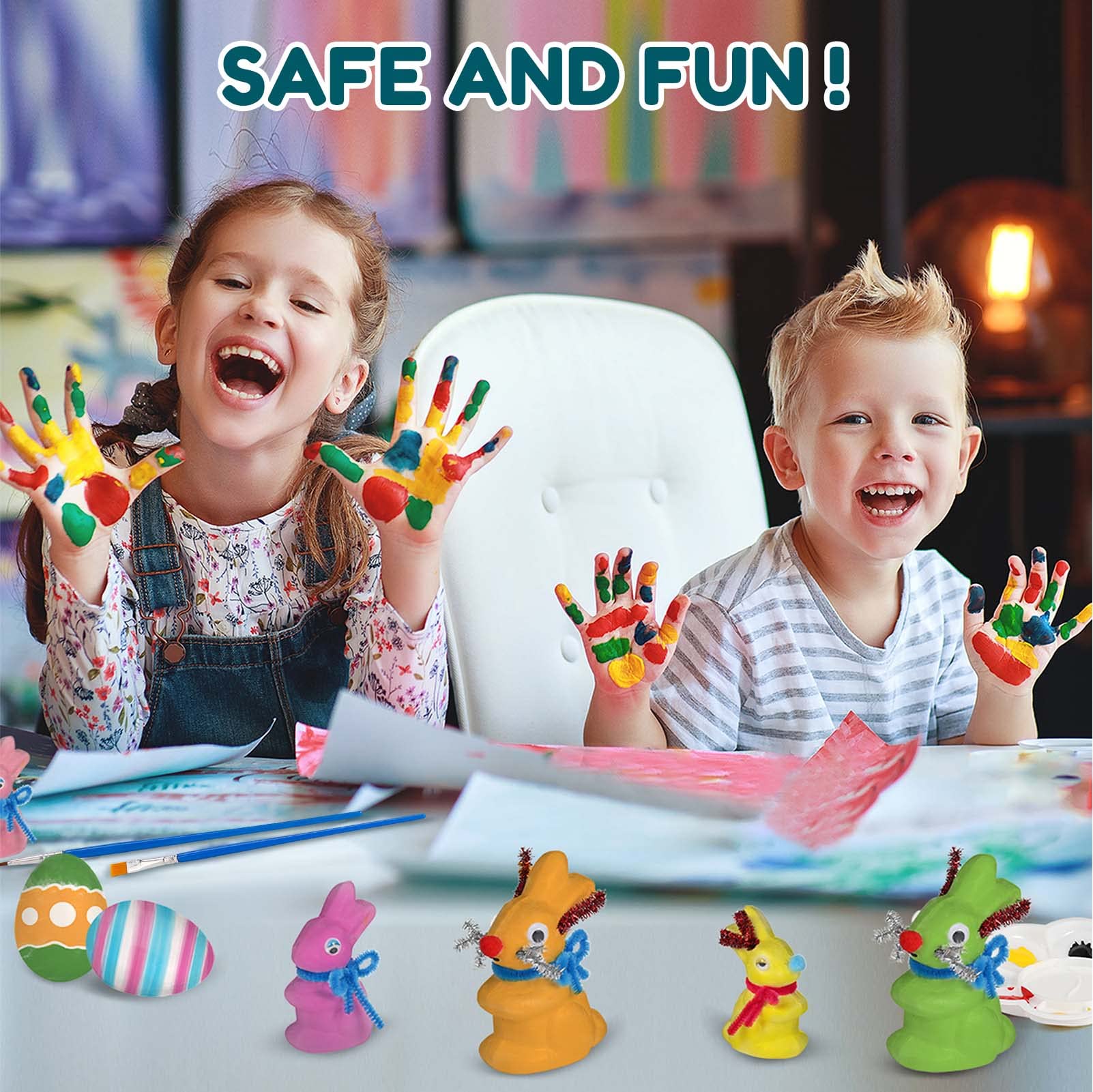 Material: Csyidio Easter bunnies and Easter eggs are made of solid foam of high density, not easy to break and scatter, very lightweight, allow you to use for a long time@Craft Bunny Kit: 12 Pcs Easter bunnies (6 large + 6small), 2 pcs Easter eggs, 6 vials glitter glues, 4 sets paints, 2 color mixing pad, 1 package of pipe cleaners, pom poms and googly wiggle eyes, 1 pack shredded paper for decoration, a rich mix Easter painting kit make you draw and create more realistic Easter eggs and rabbits@Size: The large bunny height is 10cm, small bunny height is 7.5cm. Easter eggs diameter is 6cm, the size is very cute and suitable for kids using@Creativity and Imagination: Kids’ creativity and imagination can be inspired by mixing colors and DIY their unique handmade art craft bunnies and eggs for Easter decoration@Application: Come with a beautiful gift package, great gift choice for your family and kids. Perfect for crafting projects or various decoration in different situations, such as party, Easter, household and school projects