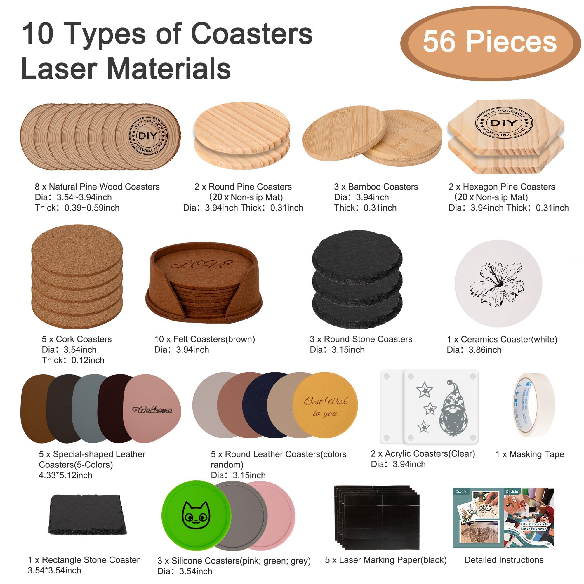 56 PCS Quality Laser Material: The laser engraving material kit contains a rich number of unfinished coaster for laser engraving and complete auxiliary tools so that you can freely customize your exclusive stainless steel accessories with the lowest cost@10 Kinds of Engraving Materials: Our engraving material box provides the most abundant coaster laser-cutting materials which contain 50 pcs blank coasters in 10 materials(natural pine wood/cork/bamboo/processed pine wood/stone/leather/felt/ceramics/silicone/acrylic)@Parameter Specification: Attached instruction provides the recommended processing parameters for each laser engraving accessory in detail, controlling the time and power more accurately, to help you quickly obtain the desired carving effect@Comprehensive Tool Set: We provide black laser marking paper to enhance the laser effect of stainless steel, stone, and acrylic items. The masking tape is included to better the laser effect of wood, felt, and leather items@Have Fun with Personalised Ideas: Suitable for laser engraving beginners, novices, and DIY enthusiasts. Work with the rich laser engraving material kit, you can freely create personalized works for your friends, loved ones, pets, and personal brands