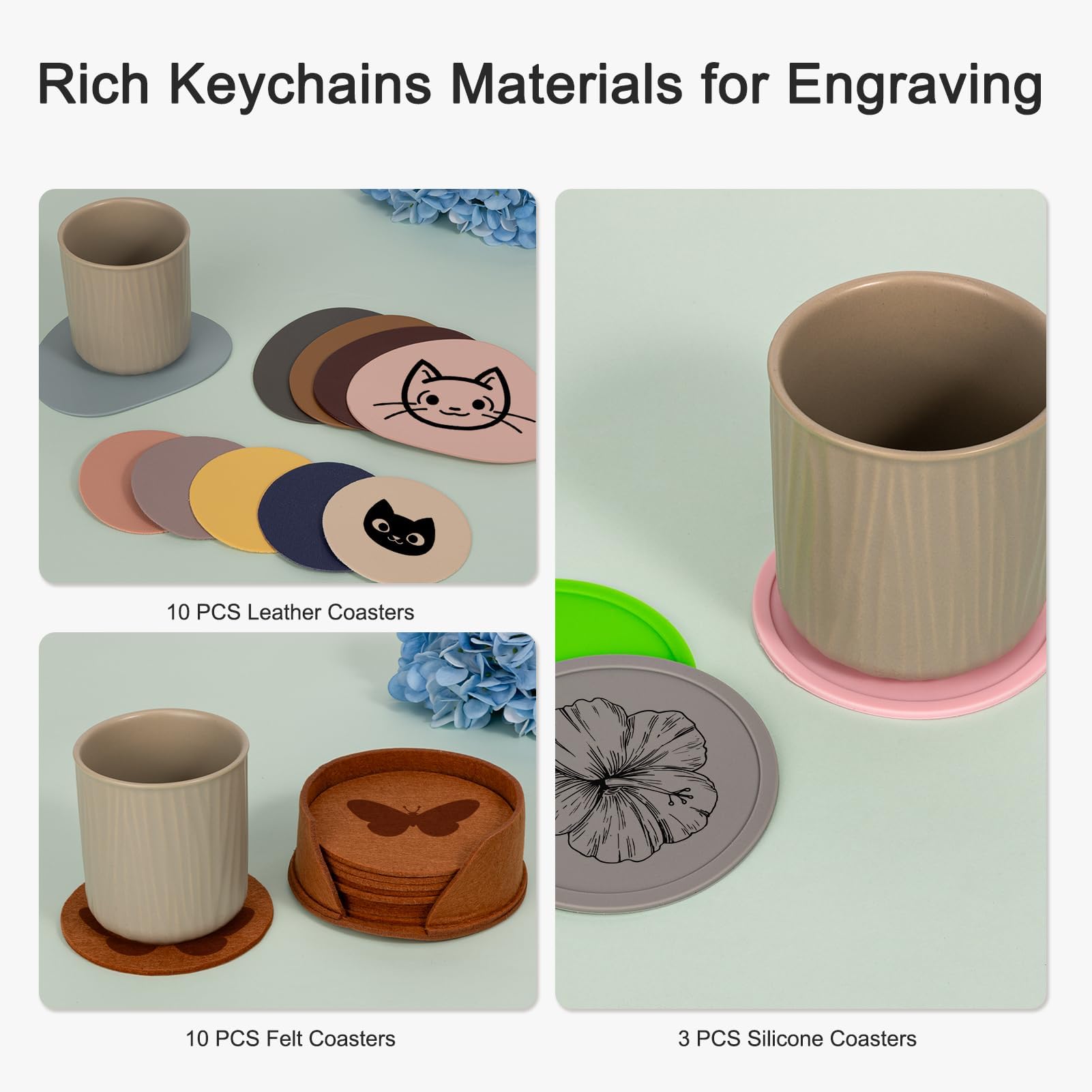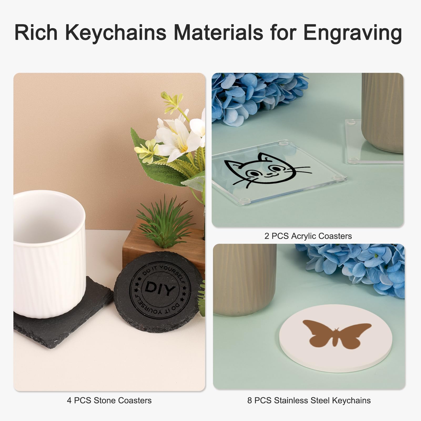 With the rich laser engraving material kit, you can carve personalized patterns on, make your own coaster decors, and give presents to others