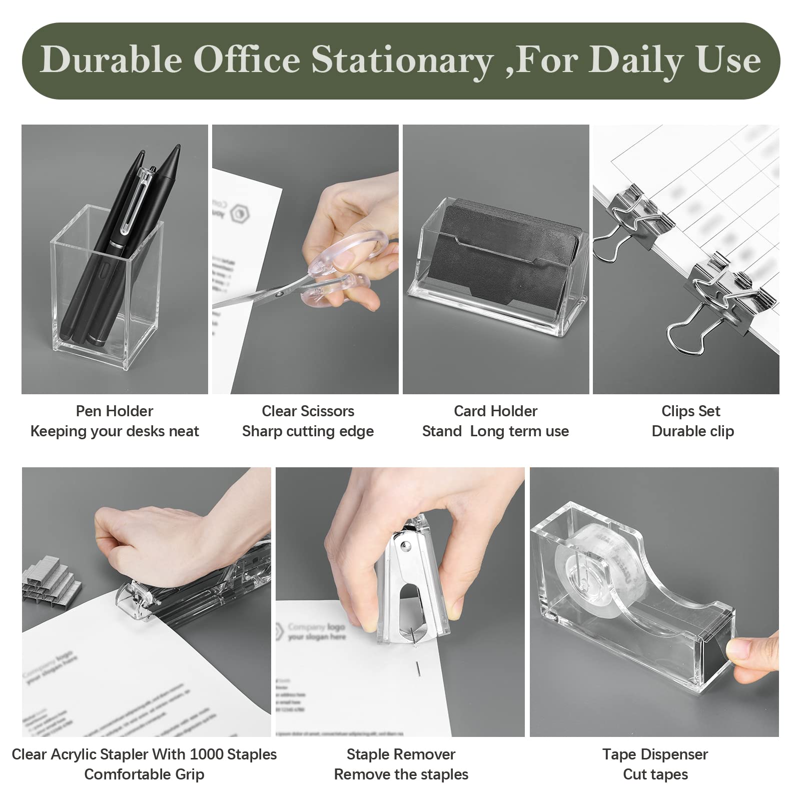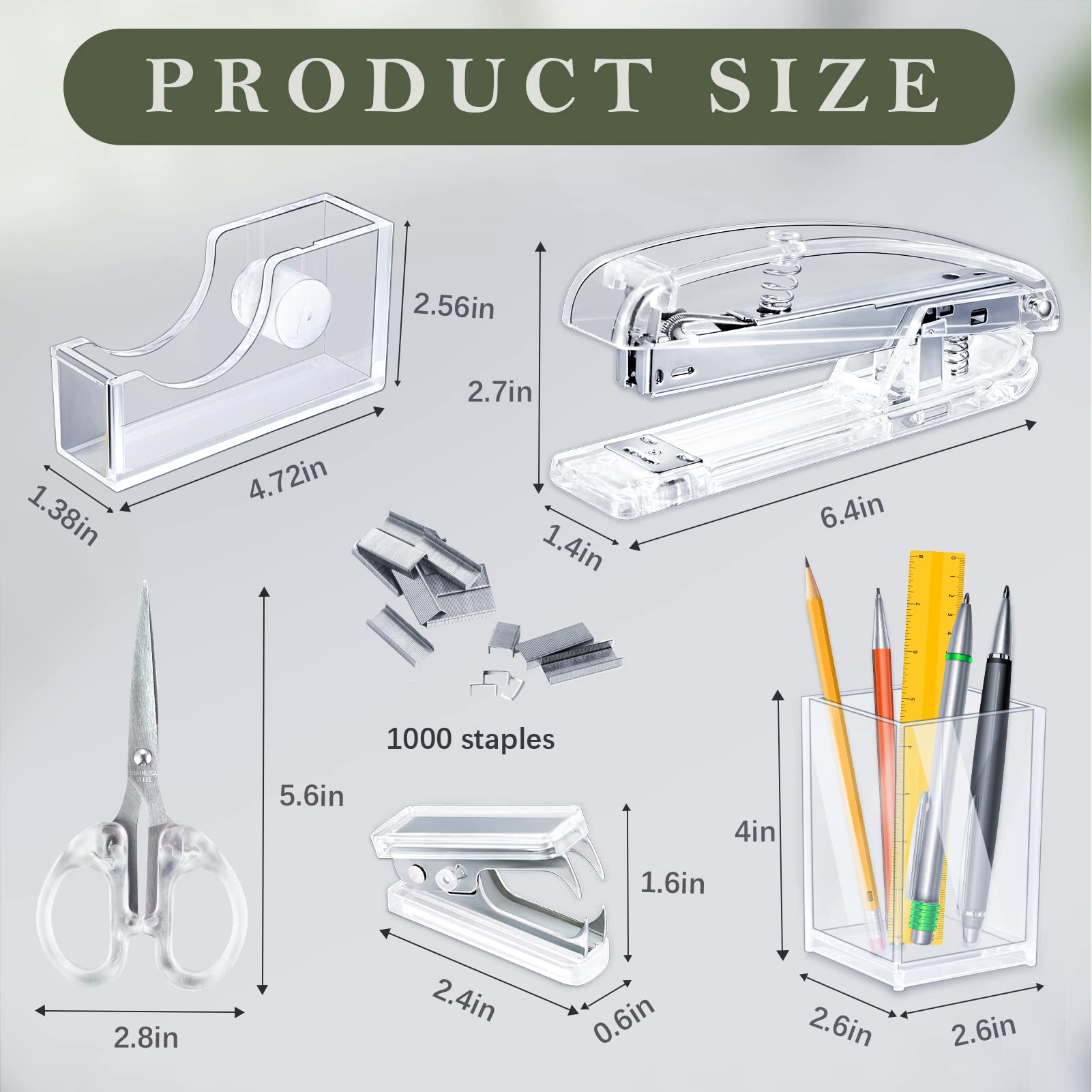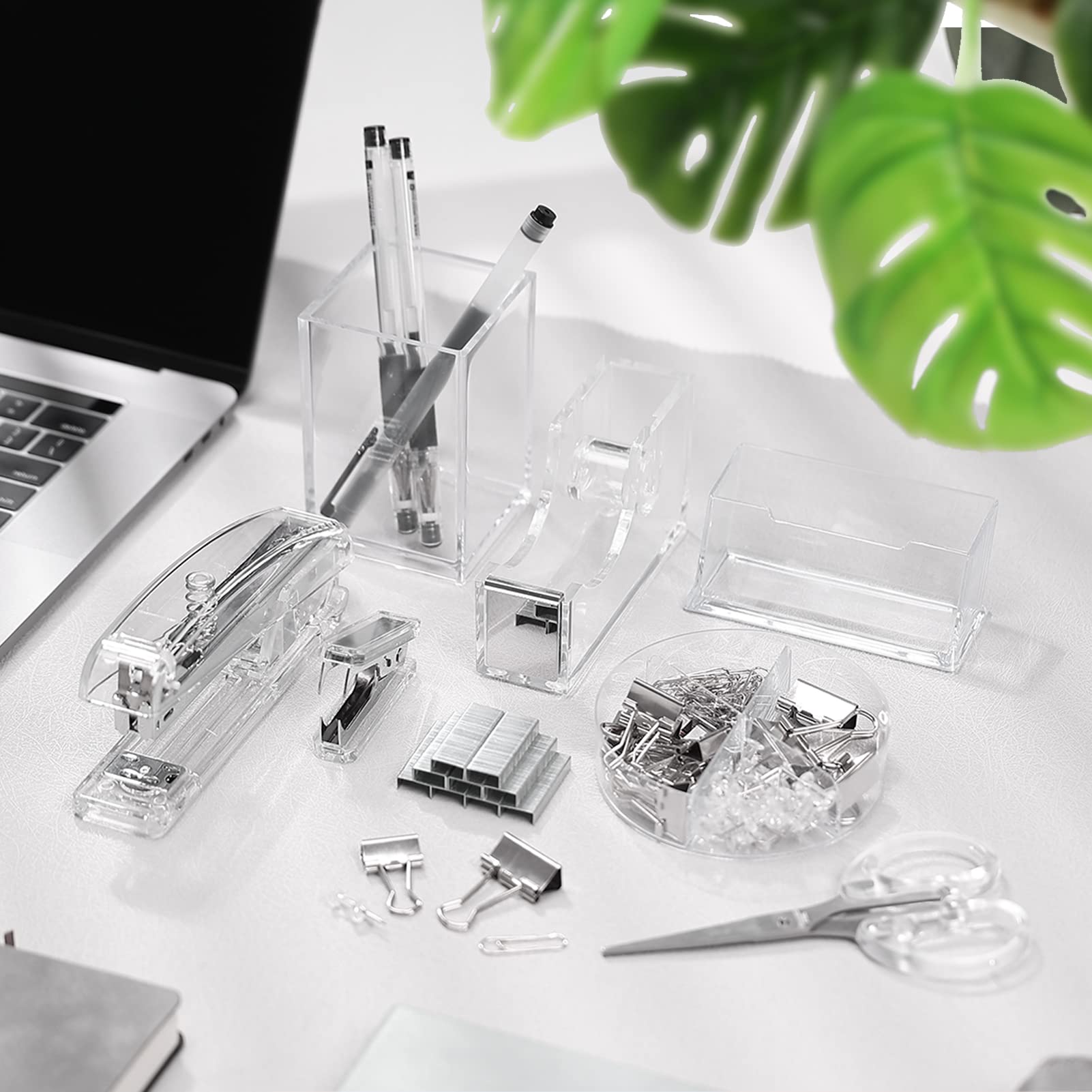 Package includes: 1 clear acrylic stapler with 1000 staples, 1 staple remover and 1 tape dispenser, 1 pen holder, 1 Clear Scissors, 1 Clips Set( 40 Paper clips, 15 binder clips, 30 Clear binders), 1 card holder stand, sufficient in quantity and rich in combination to meet your different needs for home and office use.@Styleish But Modern Design; the silver office accessories are designed in clear and silver appearances, simple but elegant, can match with most items in your home and office, bring you a modern and delicate feeling.@Elegant and Practical: Our desk set mainly made of clear acrylic, strong and sturdy enough, not easy to break and deform, practical and useful, can serve you for a long time.@Wide Application: the acrylic office supplies can be widely applied for schools, home, office and more occasions, keep your desk neater, saving your workspace, but also are stylish decorations, dressing up your table top.@Extraordinary Present: This desk accessory can not only be applied as your office or school supplies, but can also be given to friends and family members as is an extraordinary gift for birthday, graduation, holiday and more.
