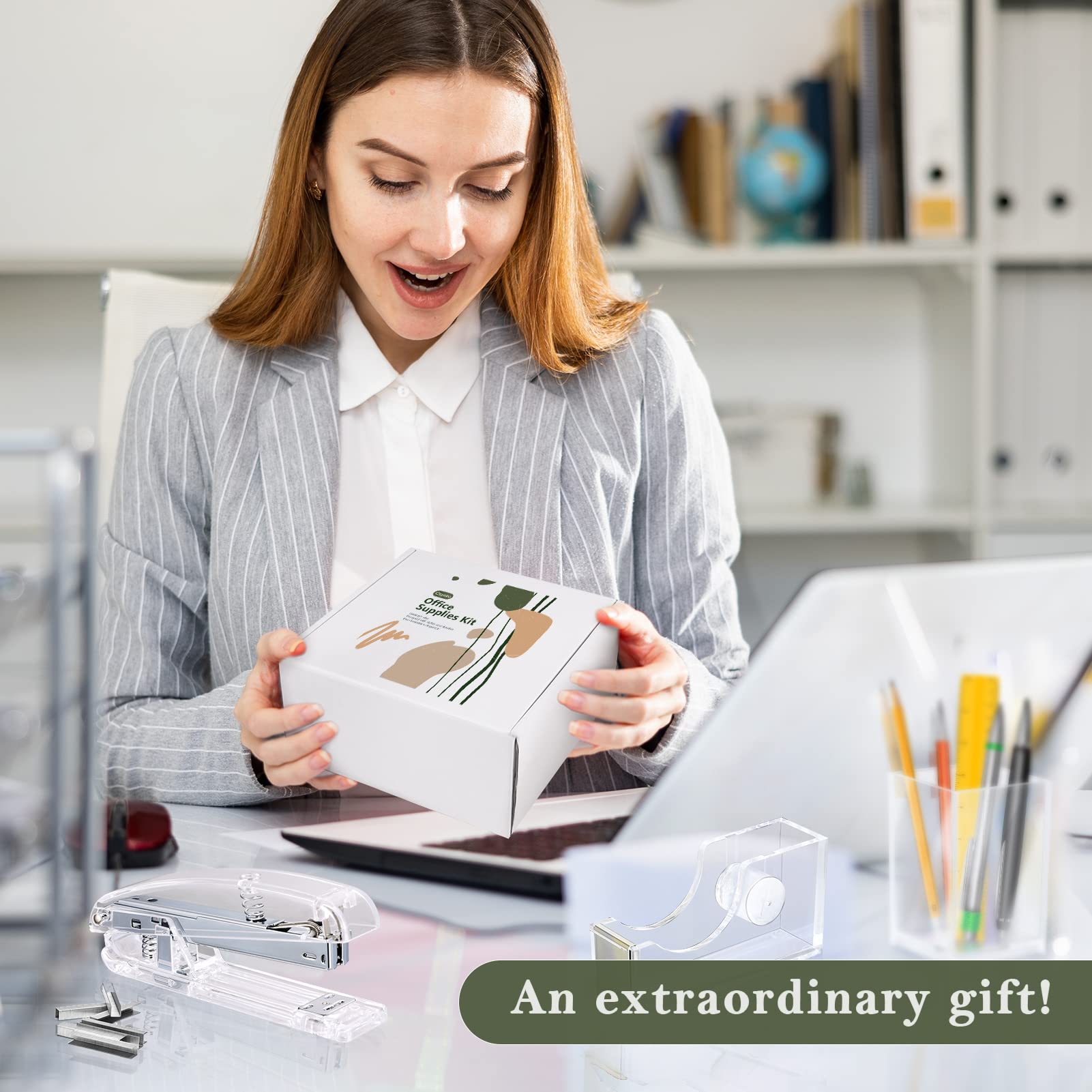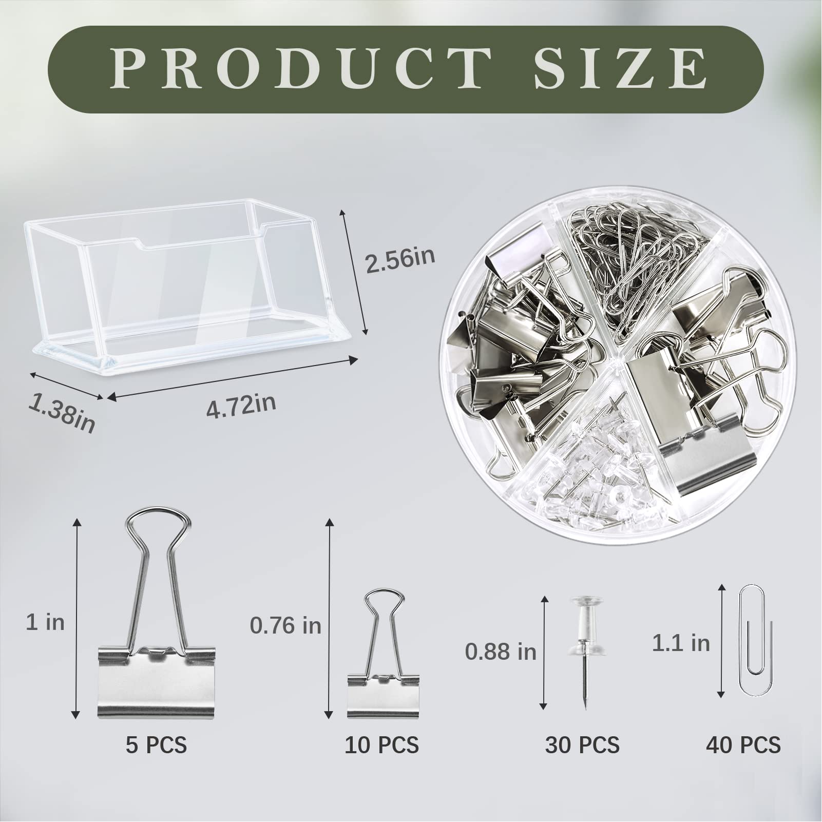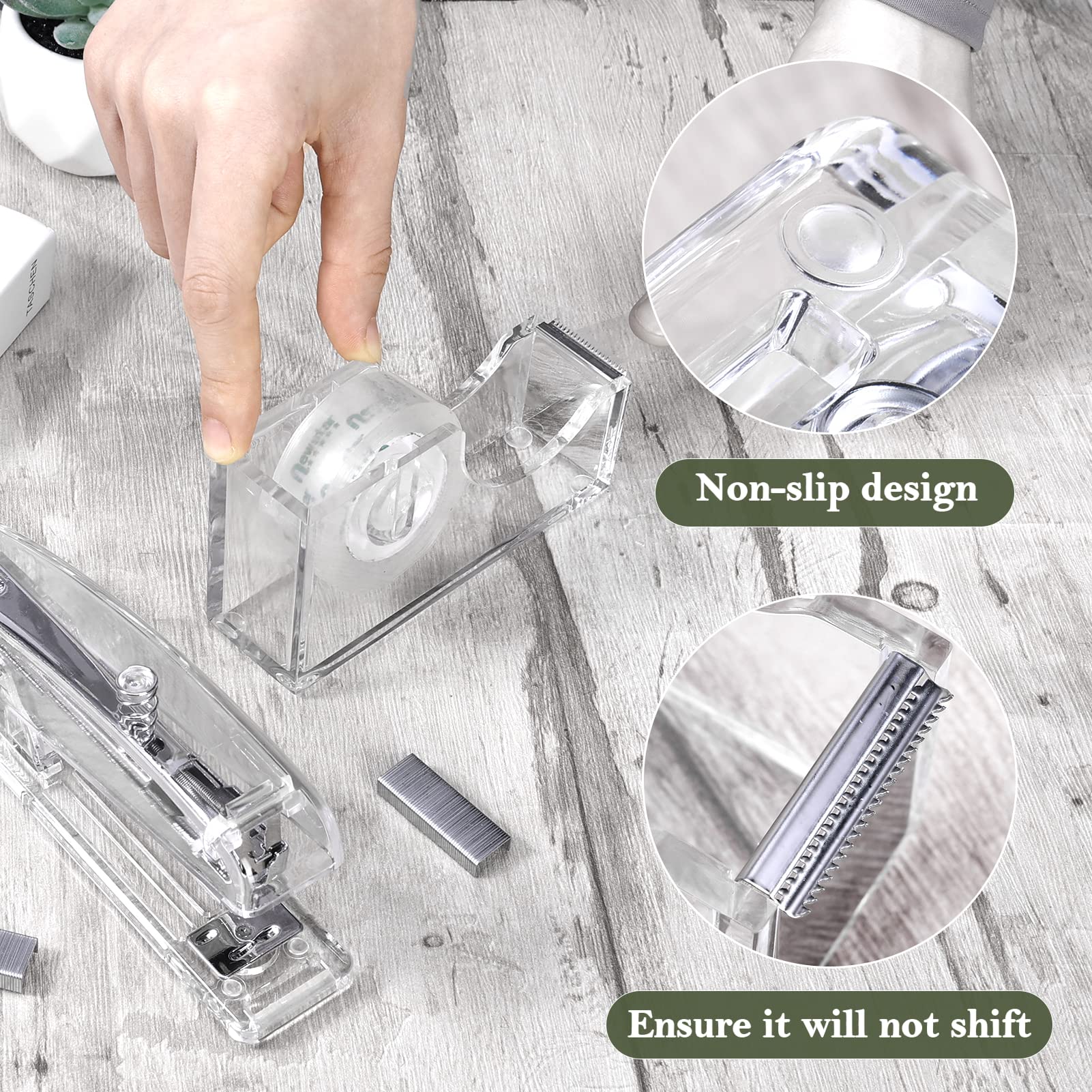 Package includes: 1 clear acrylic stapler with 1000 staples, 1 staple remover and 1 tape dispenser, 1 pen holder, 1 Clear Scissors, 1 Clips Set( 40 Paper clips, 15 binder clips, 30 Clear binders), 1 card holder stand, sufficient in quantity and rich in combination to meet your different needs for home and office use.@Styleish But Modern Design; the silver office accessories are designed in clear and silver appearances, simple but elegant, can match with most items in your home and office, bring you a modern and delicate feeling.@Elegant and Practical: Our desk set mainly made of clear acrylic, strong and sturdy enough, not easy to break and deform, practical and useful, can serve you for a long time.@Wide Application: the acrylic office supplies can be widely applied for schools, home, office and more occasions, keep your desk neater, saving your workspace, but also are stylish decorations, dressing up your table top.@Extraordinary Present: This desk accessory can not only be applied as your office or school supplies, but can also be given to friends and family members as is an extraordinary gift for birthday, graduation, holiday and more.